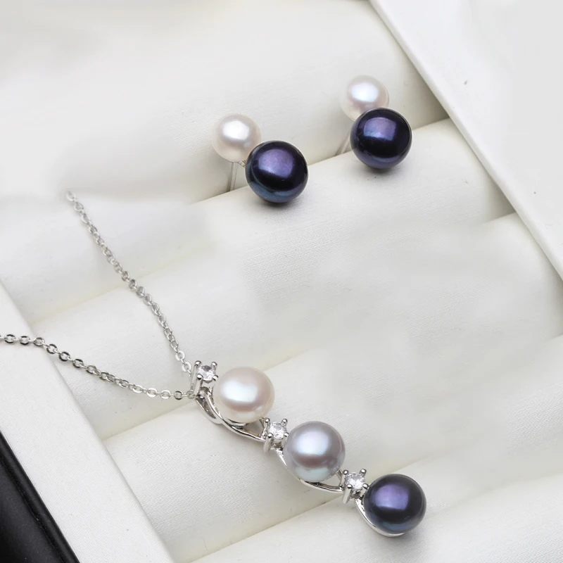 Wedding 925 Silver Natural Freshwater Pearl Necklace Earrings Set,Multi Color Pearl Jewelry Set Wife Mother Birthday Gift Black drop shipping wholesale |